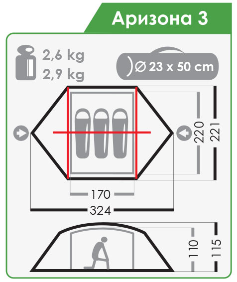 Аризона 3 — вариант палатки из обычных тканей.Обладает всеми достоинствами компоновки с внешними дугами и значительно меньшей ценой при несколько большем весе.