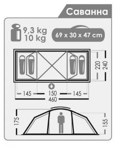 Габаритные размеры внутренней палатки, см (l x b x h) : 460 х 240 х 175