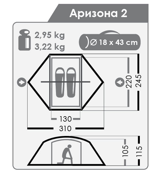 Габаритные размеры внутренней палатки, см (l x b x h) : 130 х 220 х 105