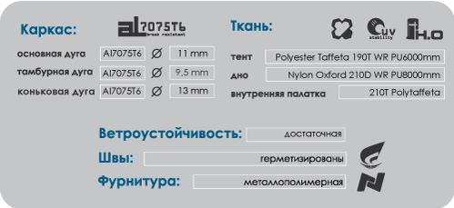 Конструкция: Двухслойная трёхдуговая полусфера с коньком и отнесенной тамбурной дугой и независимой внутренней палаткой.